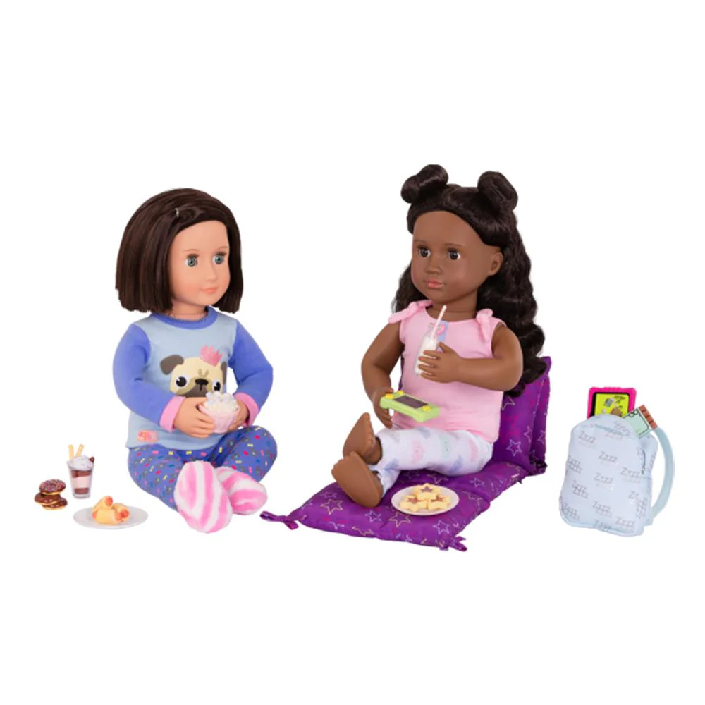 ¡Amigos, diversión y muchas delicias hacen que las fiestas de pijamas sean las más dulces! Incluye 1 colchón de almohada, 1 mochila, 1 tableta con tapa, 1 antifaz, 1 taza de postre, 1 rollo de salchicha, 1 consola de videojuegos, 1 plato de galletas, 1 pila de donas, 1 tazón de palomitas de maíz, 1 tubo de pasta de dientes, 1 cepillo de dientes, 1 barra de chocolate, 1 botella de leche, 1 cuchara. *Las muñecas se venden por separado.