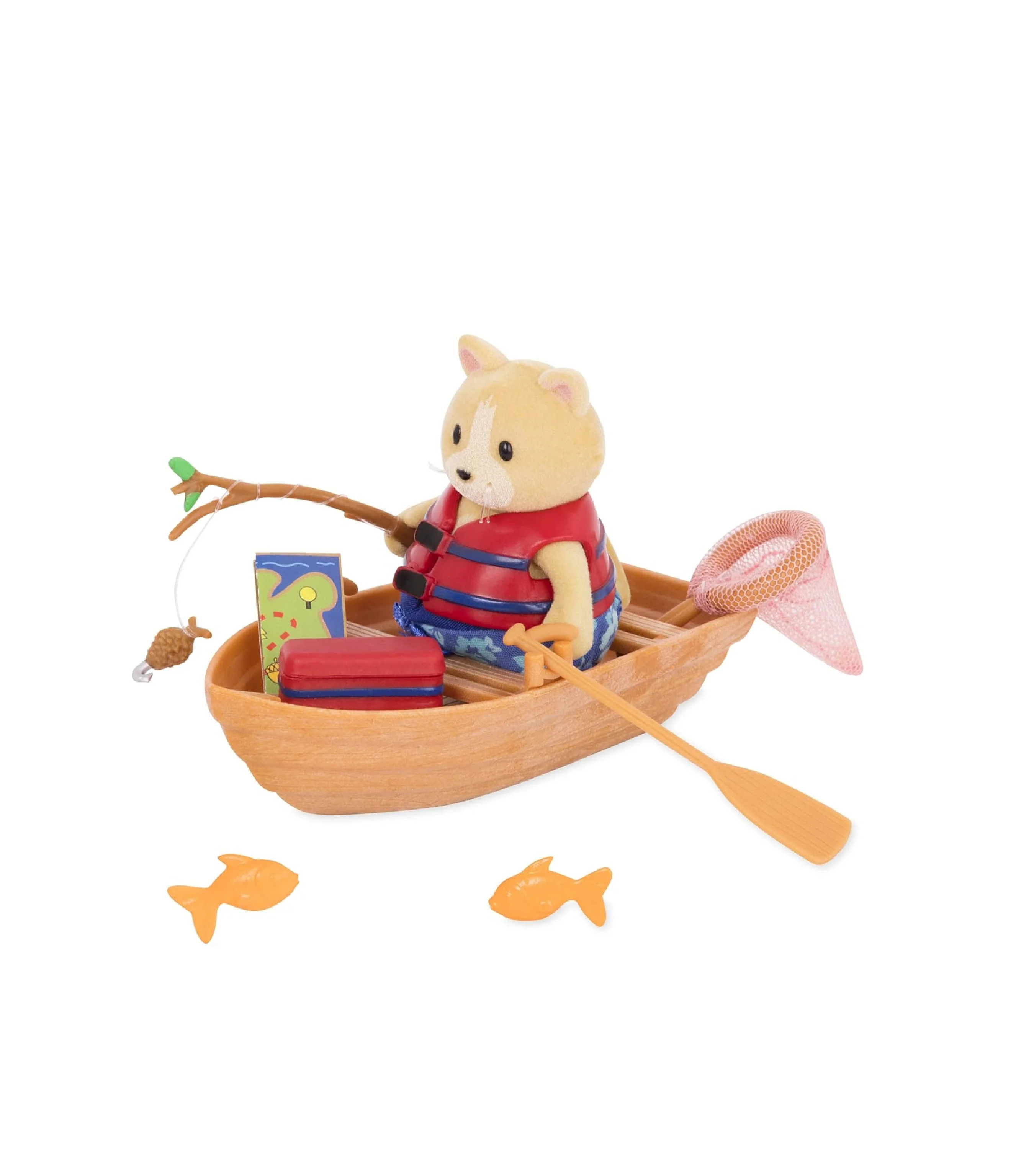 ¡Pase un día en el lago con el Playset bote! Este juego tiene muchos accesorios geniales para el juego de simulación. Incluso viene con tu propio personaje de Li'l Woodzeez: ¡Wally Whiskerelli! Este lindo personaje de gato tiene un pequeño traje de baño y chaleco salvavidas que puedes mezclar y combinar con otras figuritas. ¡Mételo en el bote y míralo remar en el agua! También se incluye una red de pesca, caña, refrigerador, pescado de juguete y más. ¡El Playset bote es el complemento perfecto para tu colección Li'l Woodzeez!