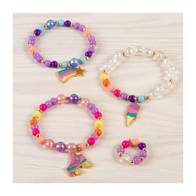 Un set creativo que convierte a las niñas en pequeñas diseñadoras de joyas. Incluye todo lo necesario para armar hasta tres pulseras multicolores y un anillo: cordón elástico transparente de 1 m, más de 70 cuentas plásticas, 30 cuentas doradas, 12 separadores dorados, 3 charms únicos, bandeja de juego y folleto de instrucciones. Estimula la motricidad fina, la coordinación visual y la confianza al crear piezas personalizadas.