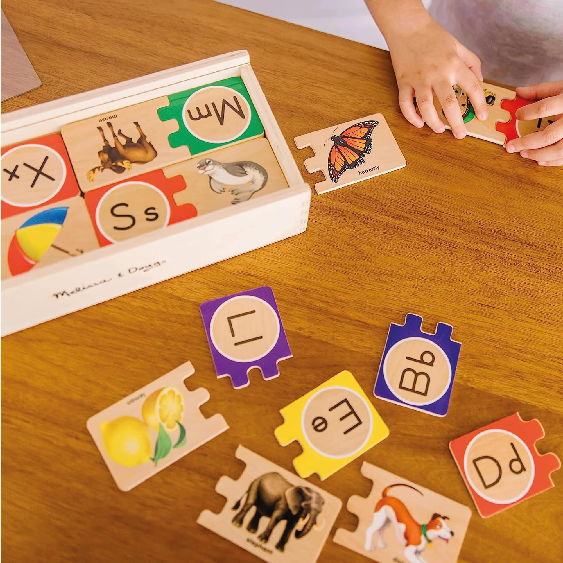 ¡Una forma entretenida para aprender las letras! .Las piezas se corrigen automáticamente (cada pieza tiene solo una combinación que encaja) para que los niños puedan jugar de forma independiente y aprender al mismo tiempo.