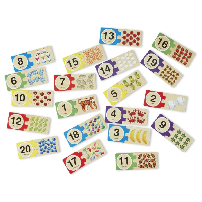 ¡Combina las mitades de los puzzles de dos piezas para aprender a contar! Las piezas incluyen números del 1 al 20 y diferentes figuras para asociar números con imágenes. Cada pieza tiene sólo una combinación, de modo que los niños pueden auto corregirse. Contiene 40 piezas en total.